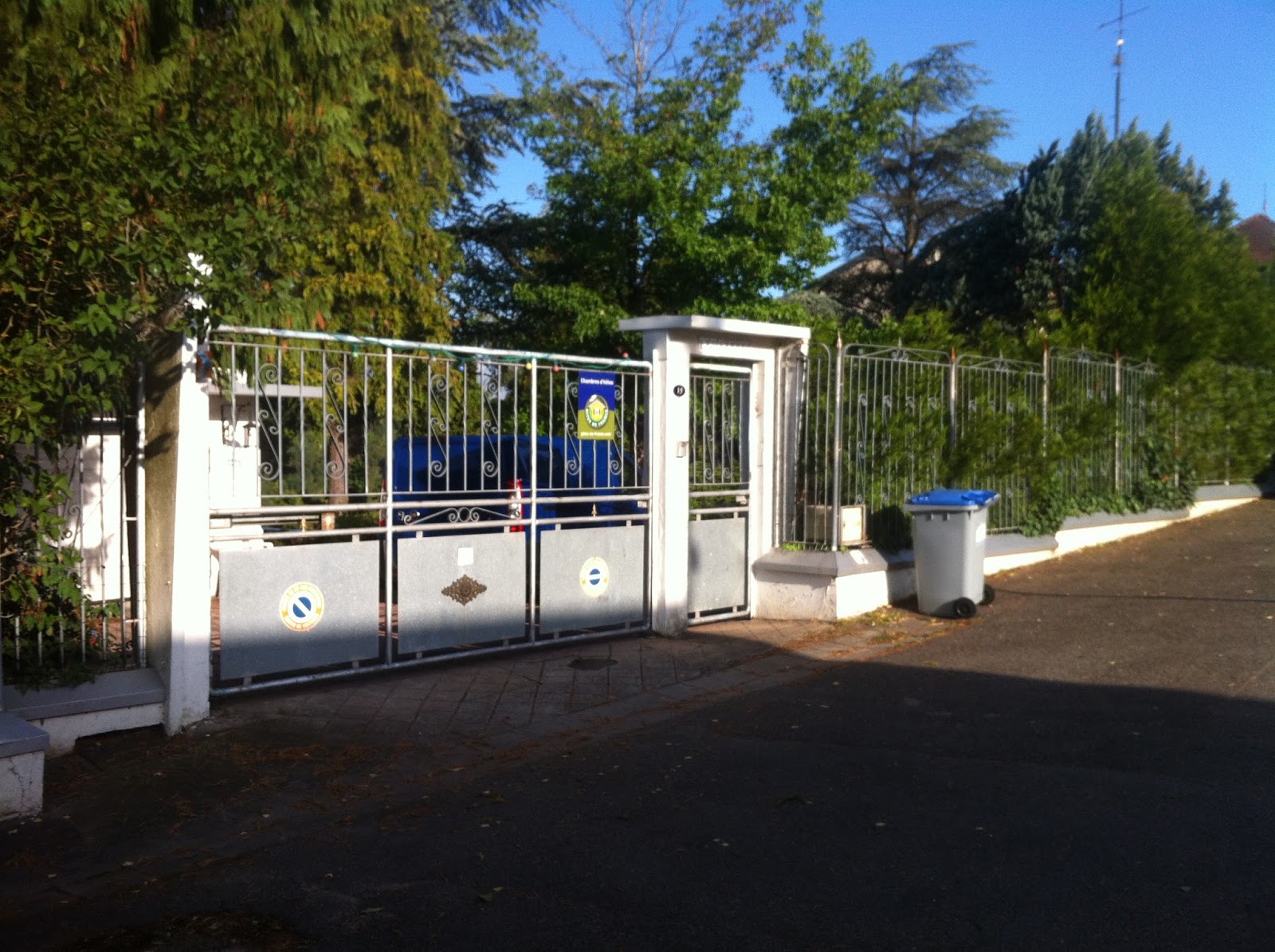 und sofort klingelt Bruni an der Tür. Hier erwartet uns eine wirklich schöne Überraschung. Der Toröffner summt und wir treten in einen Garten ein, in dem ein Weg leicht hangabwärts führt. Aus einer Kurve des Wegs kommt uns ein kleiner weißer Hund entgegen, der uns freudig begrüßt. Wir gehen weiter und kommen auf ein Haus zu, was mich an die 50/60er-Jahre Häuser an der Cote d´Azur erinnert.