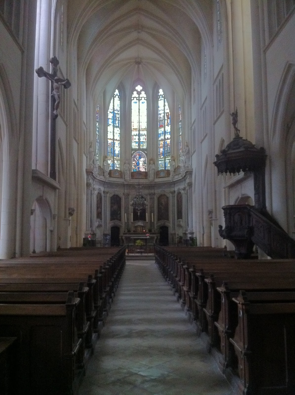 In Dieulouard gibt es eine wunderschöne Kirche, die auch offen ist. In ihr ist es so dunkel, dass mir zum ersten Mal klar wird, wie dunkel das früher für die Messbesucher gewesen ist, wenn nur Tageslicht und Kerzen den Raum erhellt haben.