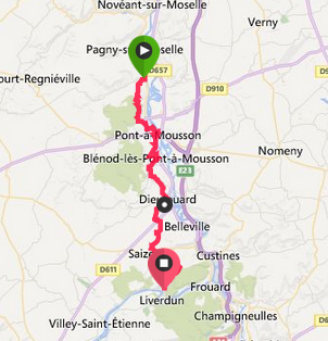 raus Richtung Jezainville, was wir auch nach einem Umweg über Blenod-les-Pont-à-Mousson erreichen. Hier sind wir wieder auf unserem „Trail“ und genießen das Wandern. Zwischendurch müssen wir mal die Regensachen auspacken aber eigentlich nur für´s Protokoll.